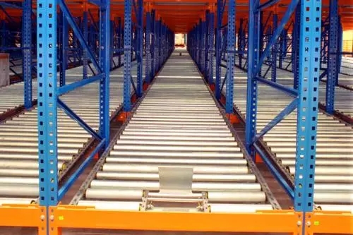 流動(dòng)式箱鋼平臺(tái)是在鋼平臺(tái)的流道內(nèi)裝有多排塑膠滾輪,流道有約5°的傾斜角,用于儲(chǔ)存箱裝貨物,貨箱在重力的作用下會(huì)自動(dòng)向前端滑移。一般高端為入貨端,低端為出貨端。貨物因重力經(jīng)由滾筒往下滑動(dòng)。